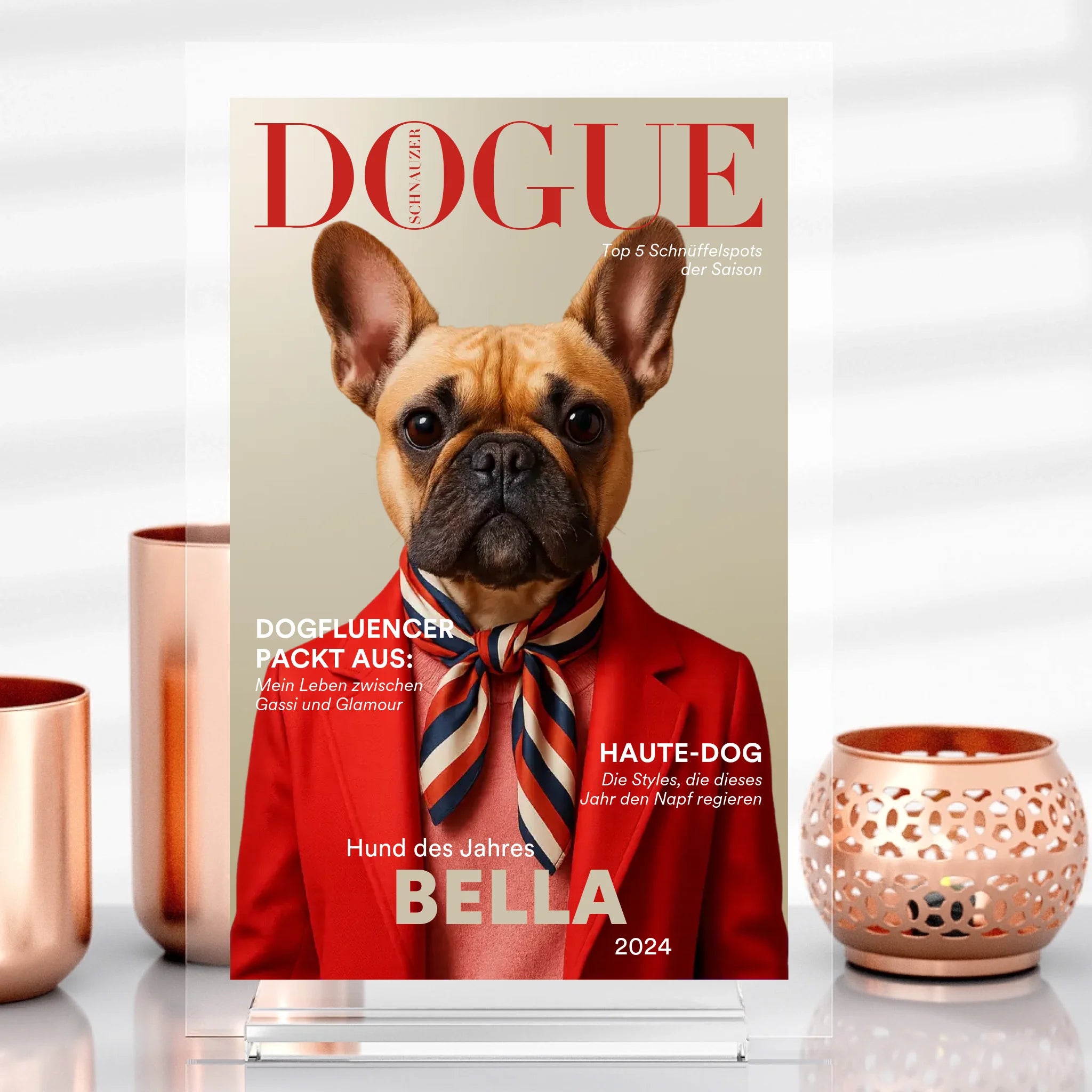 Ob Doggen-Dame mit Vogue-Attitüde, Kater mit Krönchen oder Schmusehund als Sofastar – bei uns wird dein Liebling zum Hauptdarsteller. Jedes Produkt entsteht individuell nach deinen Wünschen – liebevoll gestaltet, mit hochwertigen Materialien und einem Augenzwinkern.
